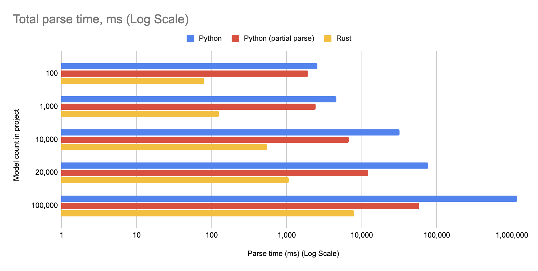 As you saw at the top of the post, I've been running some synthetic projects against an early build of the new dbt engine, and it's pretty snappy - parsing a 10,000 model project in under 600ms. Let's see how it goes with some other common project sizes: